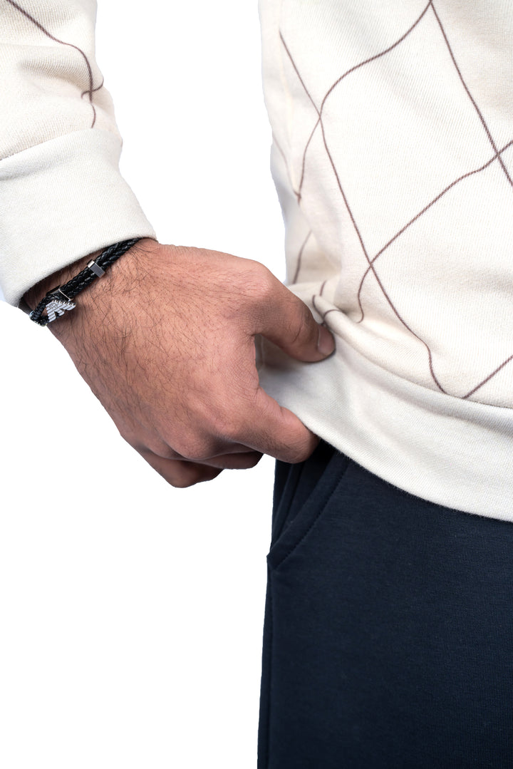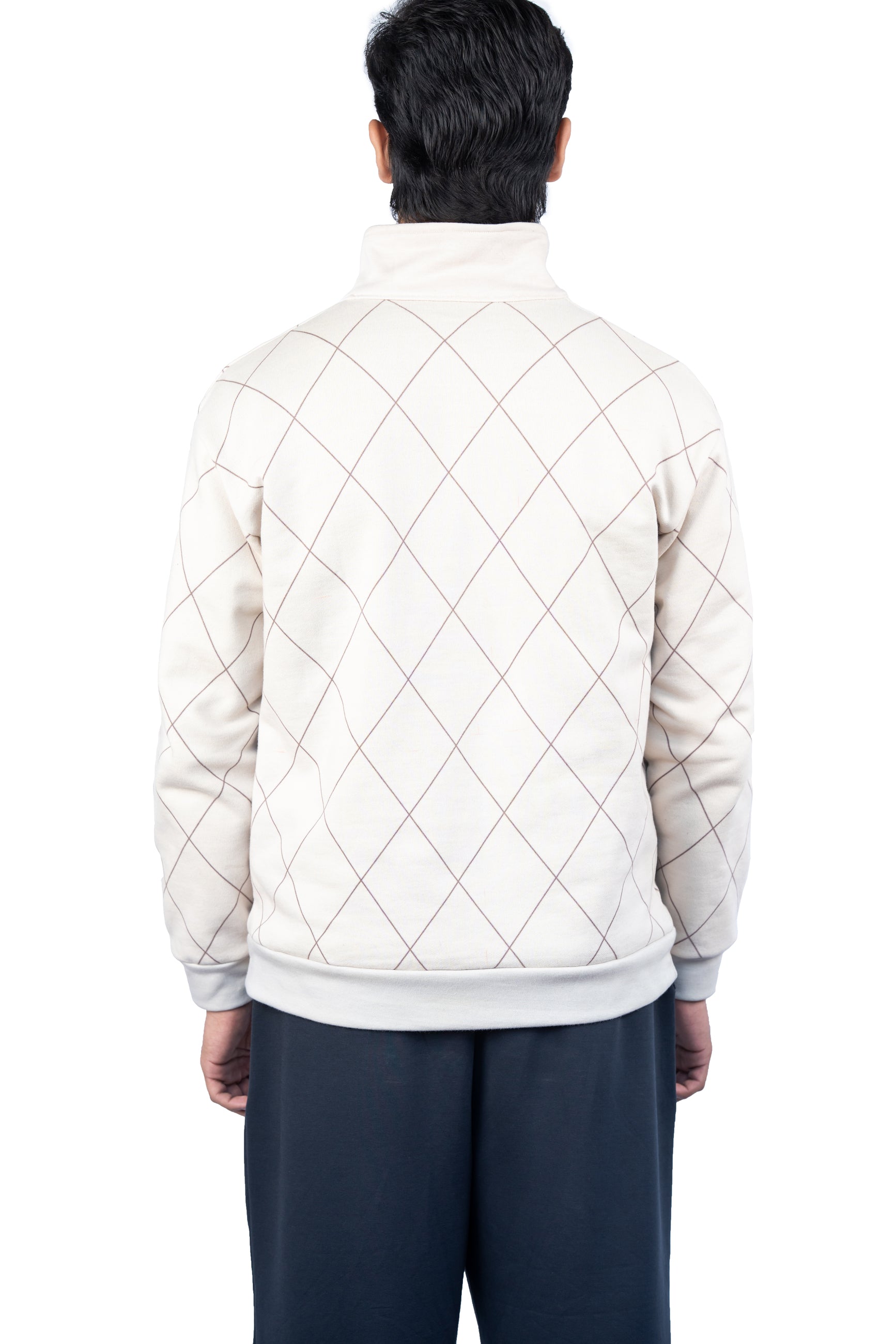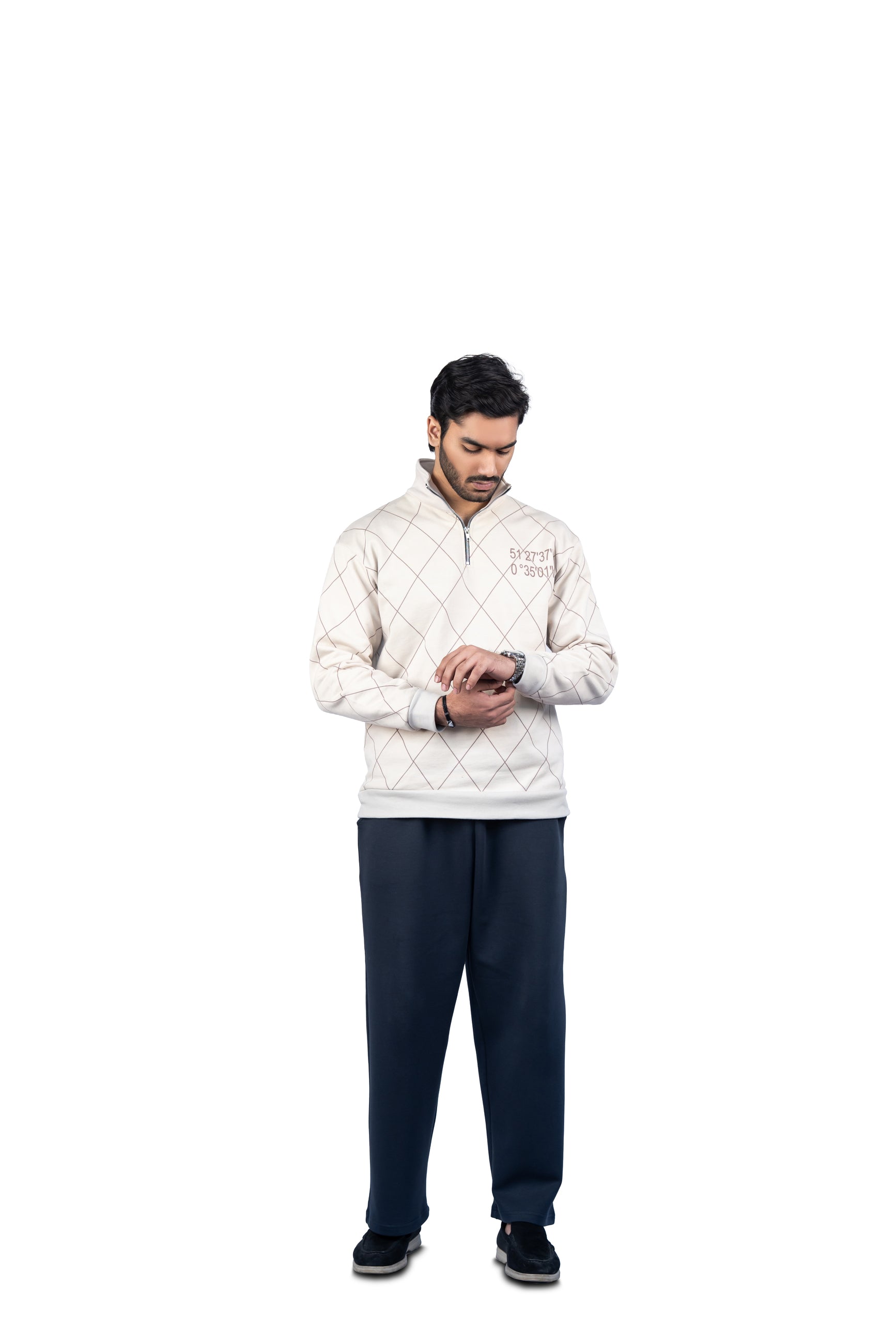 A sleek, modern knit pullover with a subtle diamond grid and precision‑style coordinates. Neutral beige, half‑zip collar, and minimalist embroidery make it easy to dress up or down—perfect for everyday wear, city strolls, or a refined casual look.